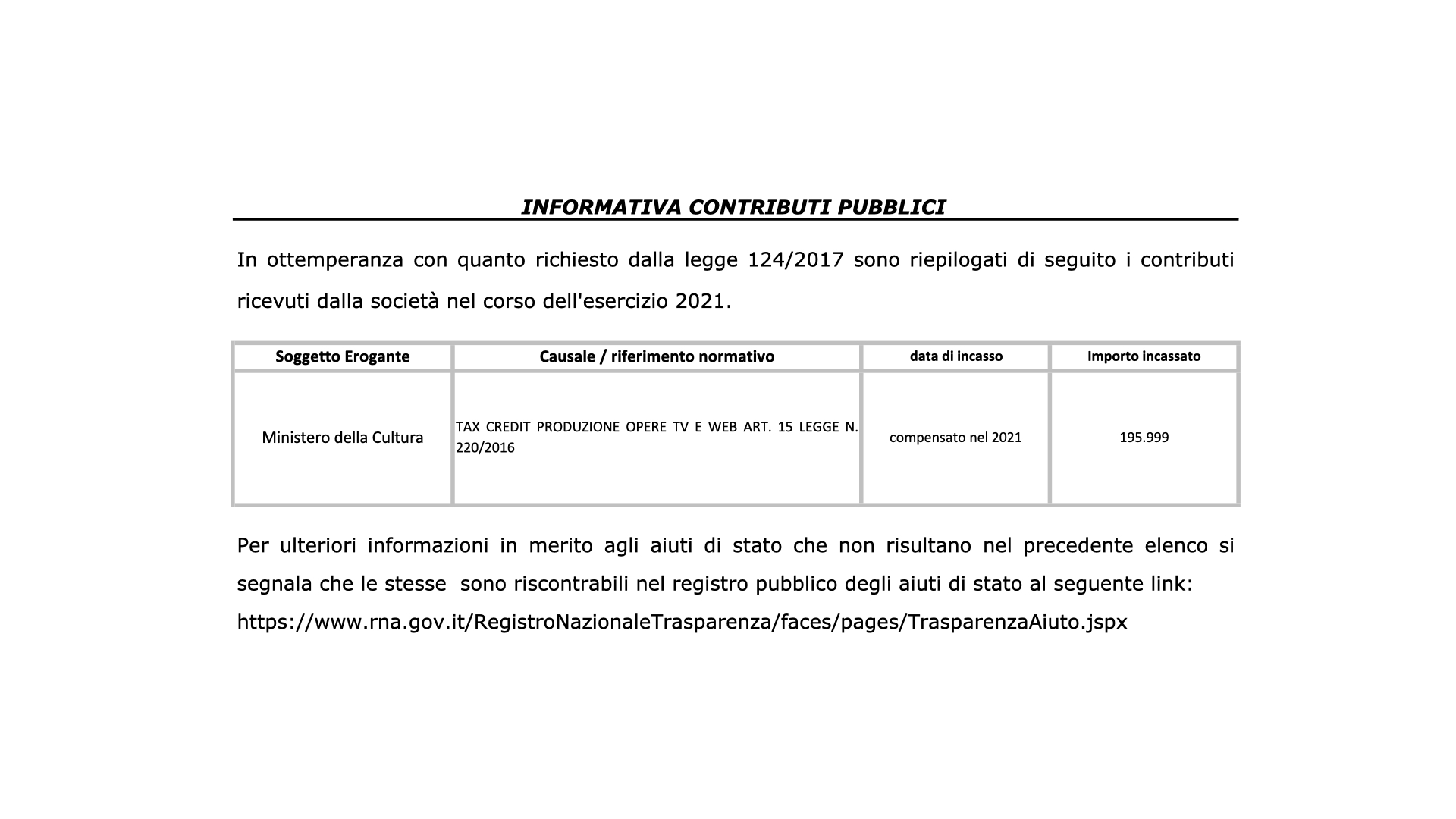 In ottemperanza a quanto richiesto dalla legge 124/2017 commi 125-129, si riportano al seguente link l’elenco dei contributi e sovvenzioni pubbliche erogati dalle pubbliche amministrazioni nel corso del 2021. Le informazioni relative ai contributi ricevuti sono riscontrabili anche al seguente link: Registro Nazionale Trasparenza (https://www.rna.gov.it/RegistroNazionaleTrasparenza/faces/pages/TrasparenzaAiuto.jspx)